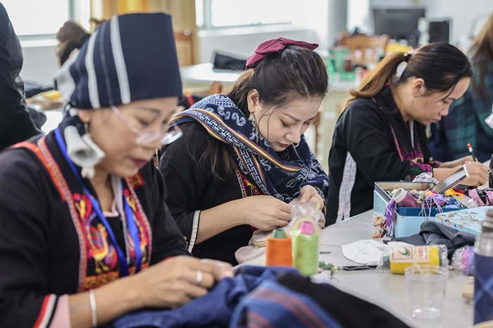 11月5日,2020年黎锦技艺研修班的学员在制作绣品。 新华社记者张丽芸 摄