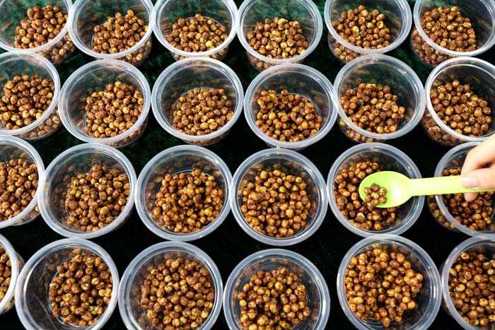 3月3日,山东省枣庄市建设路小学开展“二月二炒料豆 喜迎‘龙抬头’”活动,这是学生在展示炒好的料豆。 新华社发(孙中喆 摄)