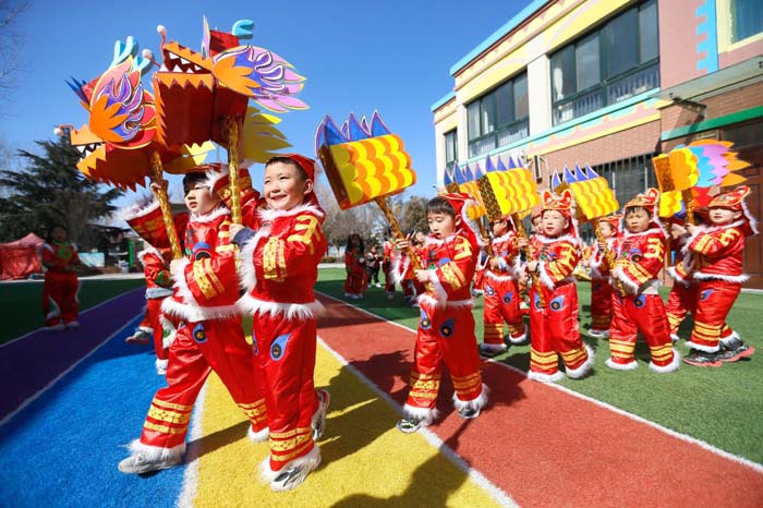 3月3日,山东省青岛市即墨区龙山中心幼儿园的孩子们在进行舞龙表演。 新华社发(梁孝鹏 摄)
