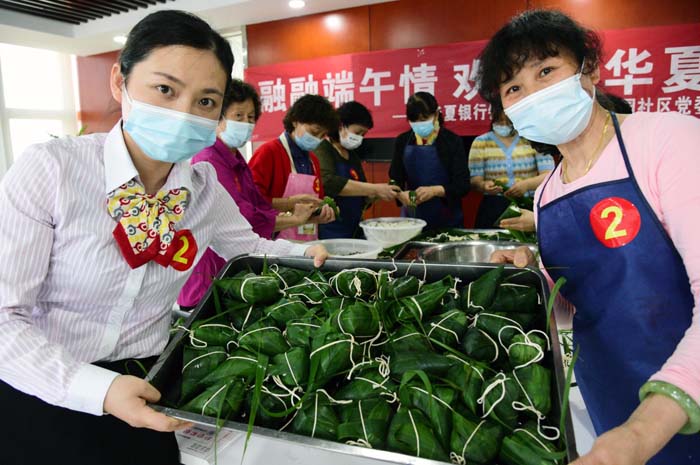 5月25日,江苏省镇江市润州花园社区居民和志愿者在包粽子比赛中展示包好的粽子。 新华社发(石玉成 摄)