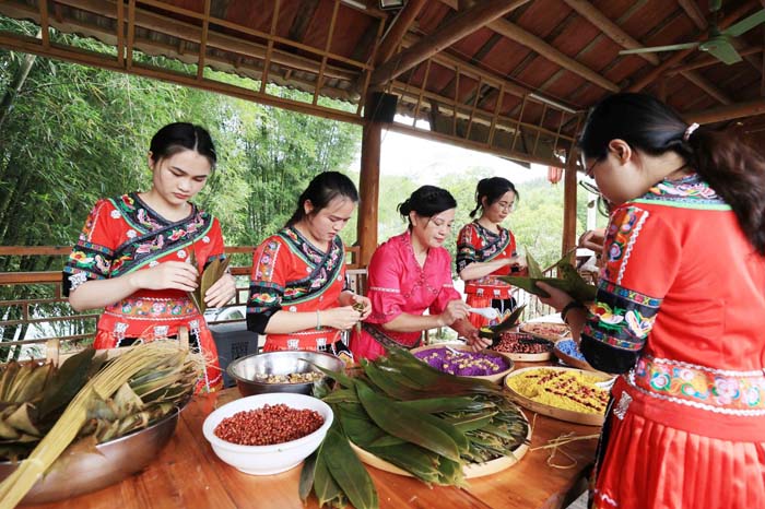 5月25日,在广西融安县雅瑶乡章口村,村民在制作五彩粽子。 新华社发(谭克兴 摄)