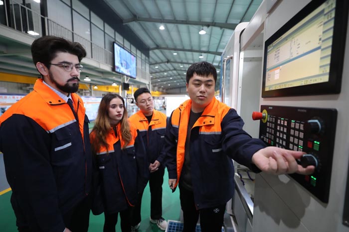 12月6日,沈工-华中数控“一带一路”订单班同学为俄罗斯伊尔库茨克国立大学的留学生讲解数控五轴加工中心操作经验。 新华社记者杨青 摄