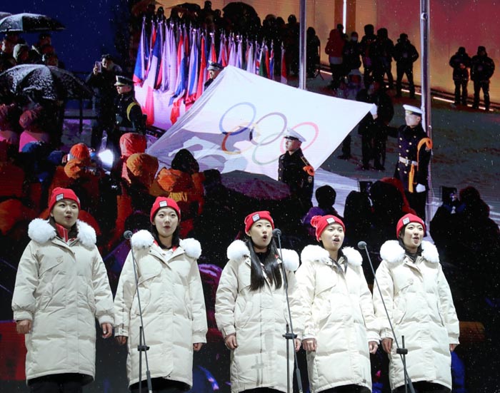 2月1日,演员在国际奥委会会旗降旗仪式上合唱。 新华社记者姚琪琳 摄