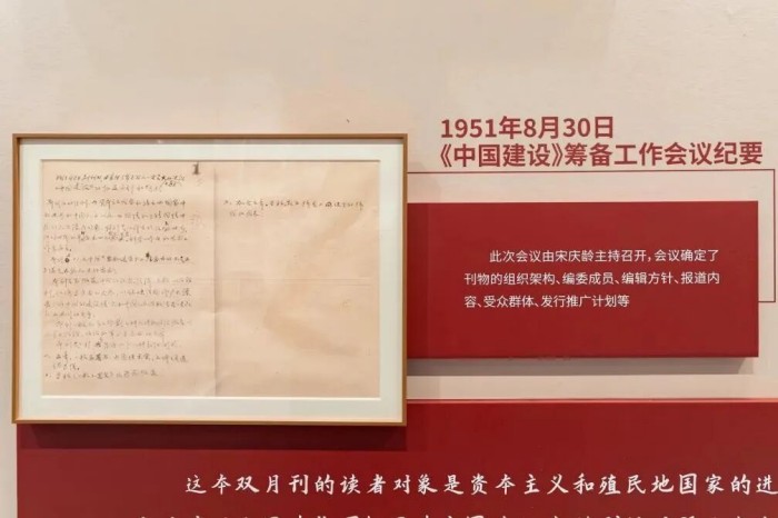 本次特展以宋庆龄的国际传播实践为主线,分“烽火岁月的真实报道”“和平建设时期的国际传播”“持续向世界讲好中国故事”三个部分。除展出大量珍贵历史照片和绚丽多彩的杂志封面外,还以图片和实物形式展出历史文献103件,其中比较珍贵的有:来自中国外文局西欧与非洲传播中心(今日中国杂志社)的1951年8月30日《中国建设》筹备工作会议纪要、1981年3月宋庆龄给中国建设杂志社的最后一封信,来自中国福利会的国际友人耿丽淑保留的《中国建设》推广发行政策座谈会议程、《中国建设》海外经销商名单、《中国建设》附册,来自上海市档案馆的中国福利会203卷英文历史档案、中国建设杂志社工作报告等历史档案,来自北京宋庆龄故居的1979年9月宋庆龄《致〈中国建设〉读者》手稿,来自上海宋庆龄故居的1962年1月宋庆龄《真实报道的传统》英文底稿、宋庆龄与周恩来往来书信和会谈纪要等。