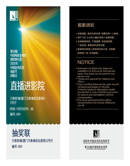 此外,11月15日当天,凭“厦金光影通”票券,可至全市20家合作影城,兑换观影券观看第38届中国电影金鸡奖颁奖典礼暨2025年中国金鸡百花电影节闭幕式直播专场。