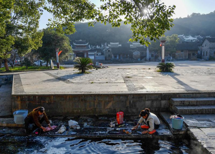 11月26日,郴州永兴县板梁村民在水边洗衣服。新华社记者赵仲志 摄