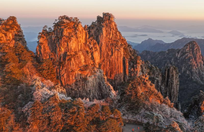 12月14日在安徽省黄山风景区拍摄的雪后日出美景(无人机照片)。