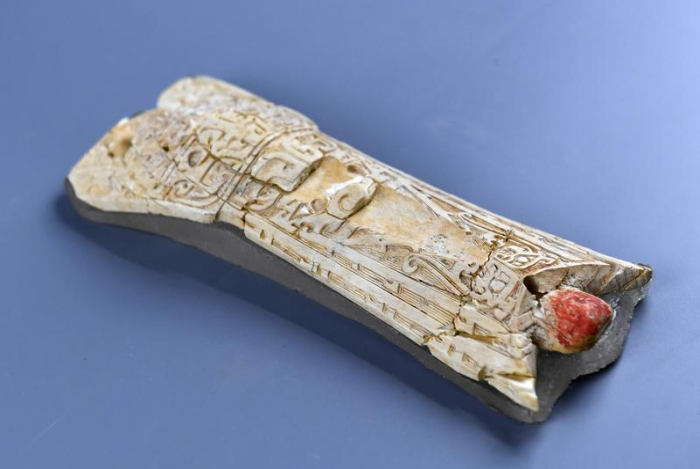 这是陕西清涧瓦窑沟墓地出土的雕花象牙器(2025年12月8日摄)。新华社记者李一博 摄