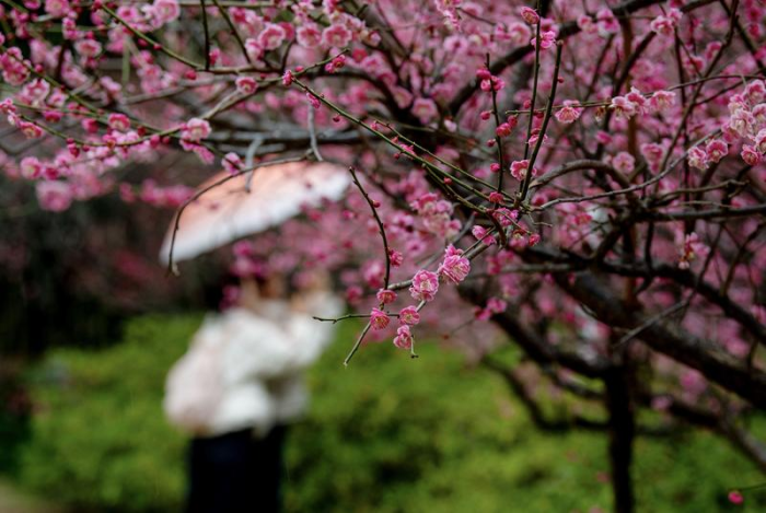 3月1日,在江苏省泰州市梅兰芳公园,游客冒雨赏花。新华社发(杨玉岗摄)